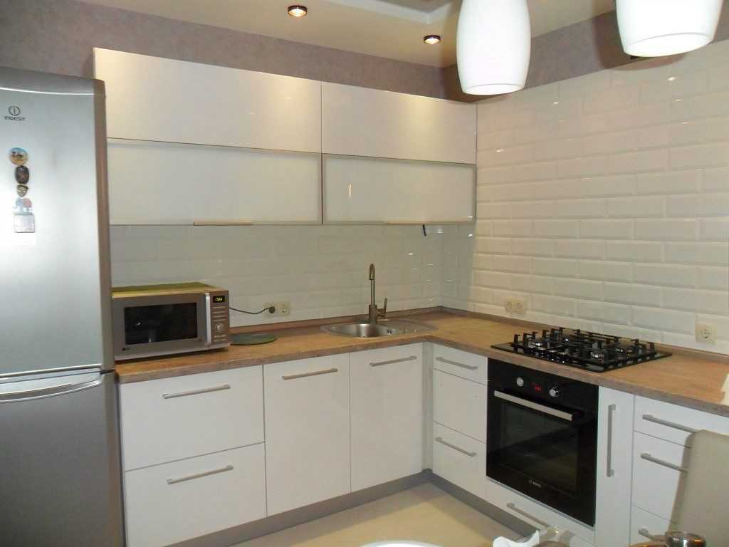 Угловая (L-/Г-образная) расстановка мебели и техники является универсальным вариантом, применяющимся в помещениях разной площади. Основополагающие точки (плита, мойка, холодильник) должны находиться на условных вершинах треугольника практически равноудаленных от центра кухни. Шкафы же располагаются вдоль стены. И как бы вам не хотелось разместить шкафчики в обеденной зоне, рекомендуем вам не делать этого. Пространство для приема пищи должно быть освобождено от громоздких предметов и максимально открыто. Советуем применить принцип зонирования при помощи декоративного оформления стен и пола вокруг обеденной зоны. Очень выигрышно такая конфигурация смотрится в небольших квадратных кухнях площадью 8-10 кв. метров.