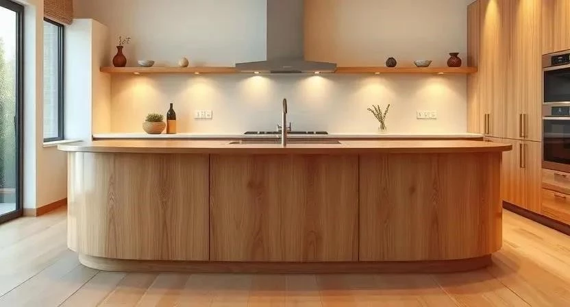 - Кухня: Установите барные стулья с изогнутыми спинками и столешницу с закругленными углами.