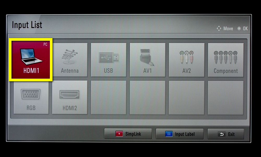 Для того, чтобы настроить телевизор, откройте список источников сигнала и вместо ТВ выберите название порта, в который вы подключили кабель. Если же картинки нет или оно каким-либо образом искажено, нужно перейти к более детальным настройкам.