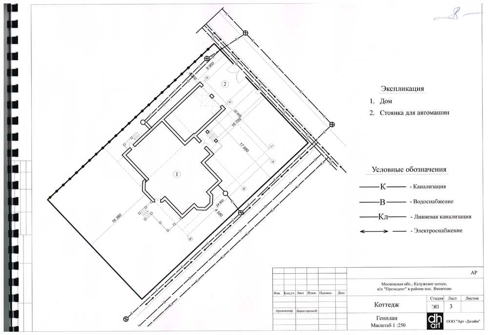 - Генеральный план дома. На генеральном плане отражено общее размещение дома на участке и расположение прилегающих пристроек, схематичное расположение подвода к дому инженерных коммуникаций (канализация, водоснабжение, ливневая канализация, электроснабжение, газоснабжение).