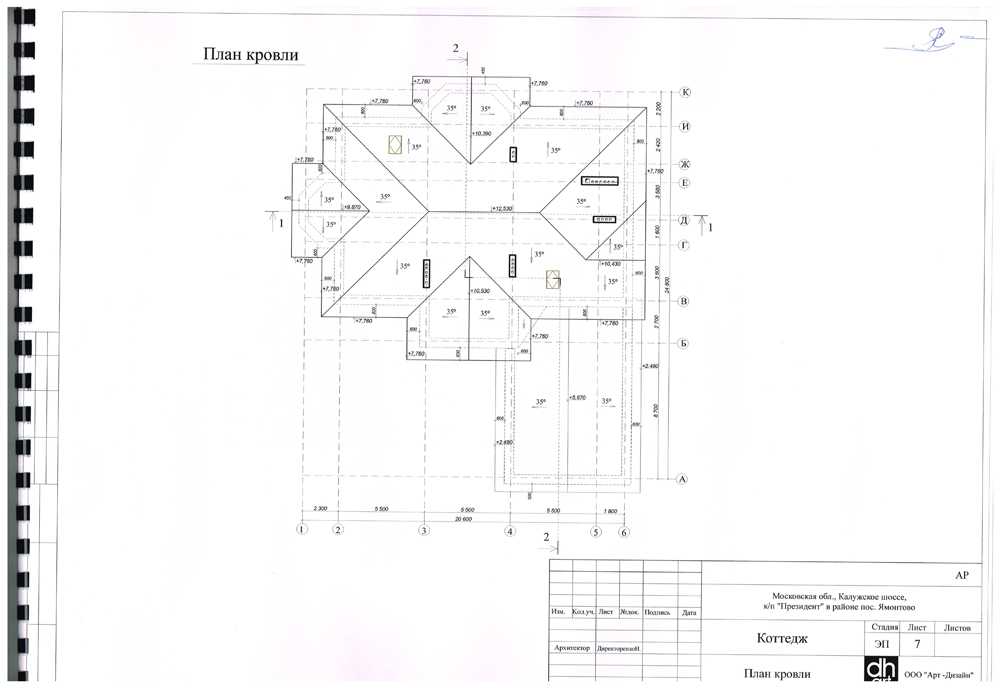 - План кровли. На плане кровли указываются поверхности кровли со сторонами и углами наклона. Отмечается высота верхней точки каждой поверхности.