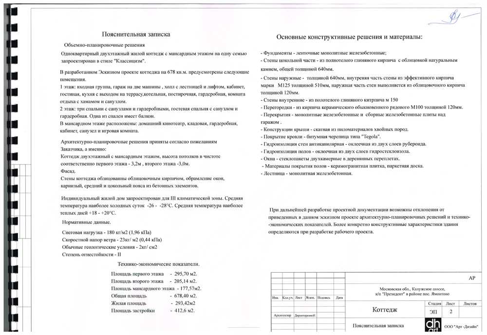 - Пояснительная записка. Пояснительная записка включает в себя краткое описание дома (архитектурный стиль, общая площадь, этажность), перечень помещений по этажам, краткое описание элементов отделки фасада дома, особенность климатической зоны, для которой проектируется коттедж, основные конструктивные решения и материалы).