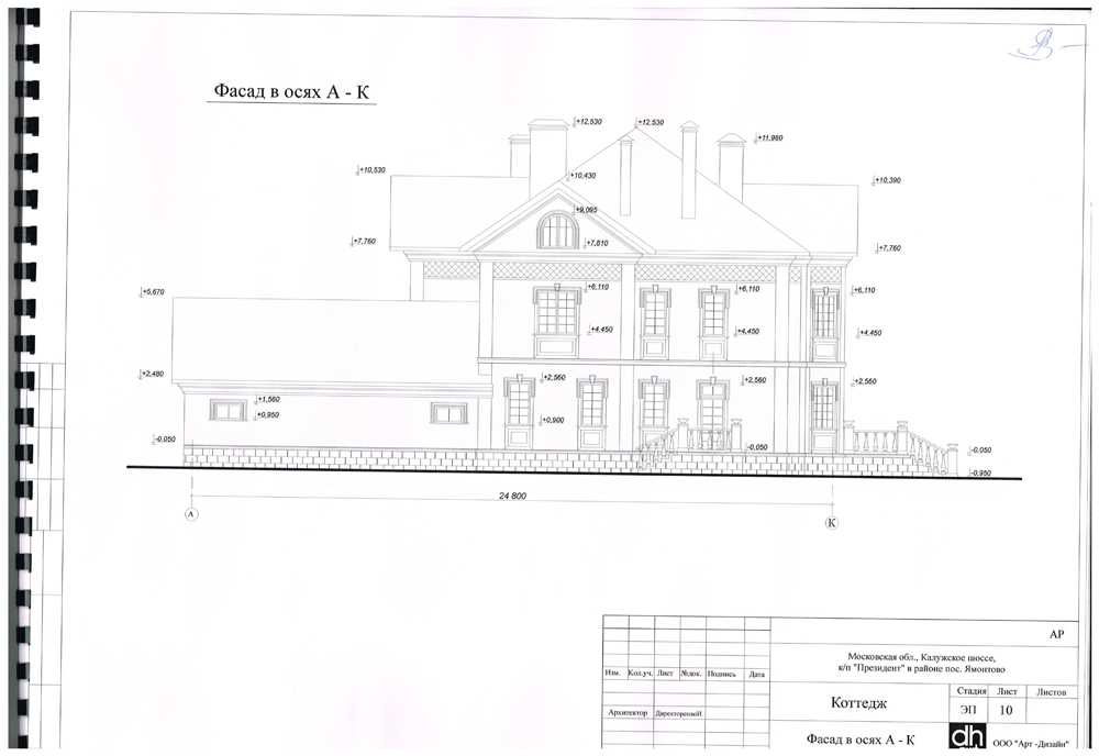 - Фасады в осях. На чертежах отражён вид основных декоративных элементов фасада, а также высота их расположения.