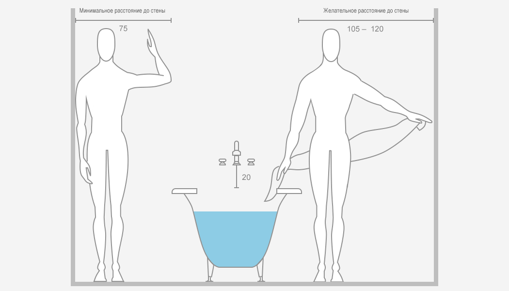 - 105-170 см пустого пространства потребуется по сторонам от ванной, чтобы было комфортно расставить руки, вытереться, раздеться-одеться.