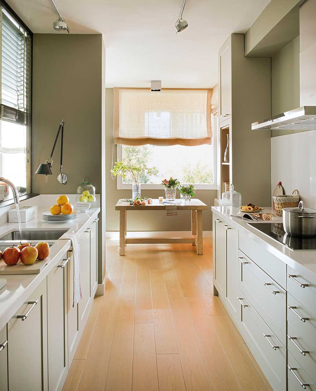 Двухрядная линейная планировка может «прижиться» в маленькой комнате, но только с оговорками. Во-первых, глубина шкафов должна быть минимальной, иначе все пространство «съедят» шкафы, расположенные навстречу друг другу. А, во-вторых, допустимая ширина кухни для такого расположения должна быть, как минимум 2,2 метра. В-третьих, один ряд шкафов придется делать чуть короче, чтобы поместилась обеденная зона.