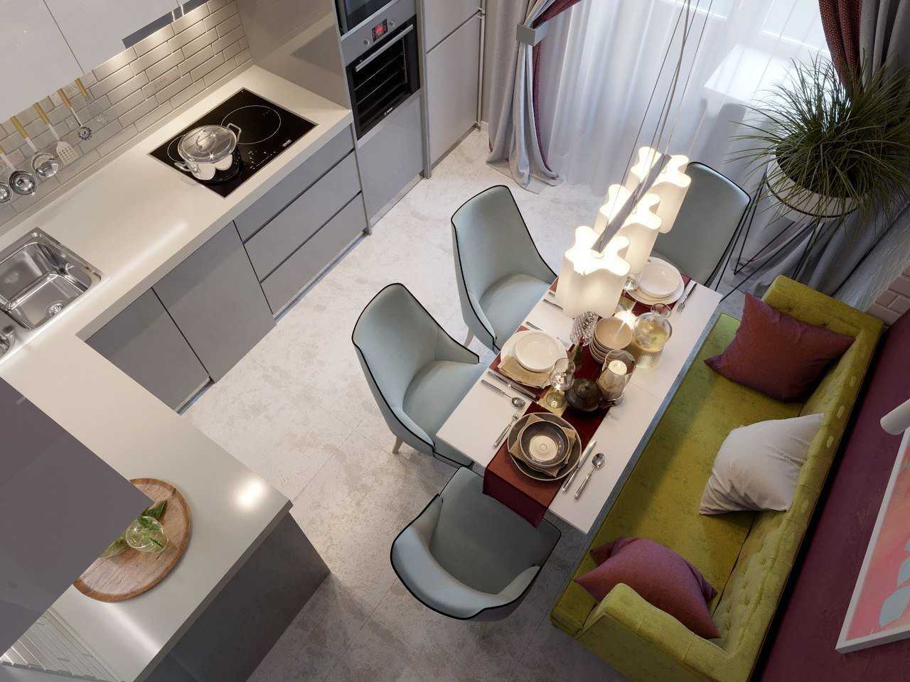 - Такая планировка сама по себе «подсказывает» варианты зонирования. При угловой расстановке кухонного гарнитура, появляется обеденная зона, где можно разместить стол и стулья, а также компактный диван.