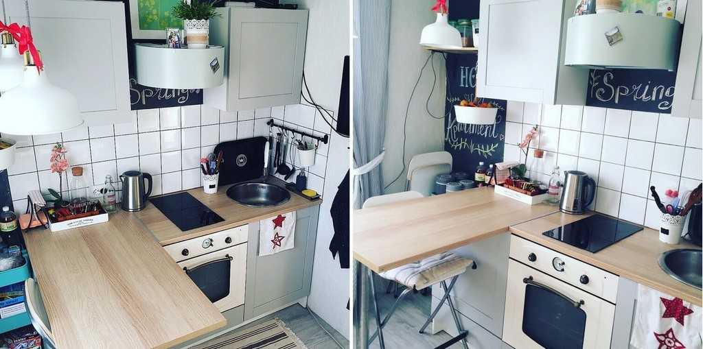 Чтобы на очень маленькой кухне разместить еще и обеденную зону, вам потребуются нестандартные решения. Например: