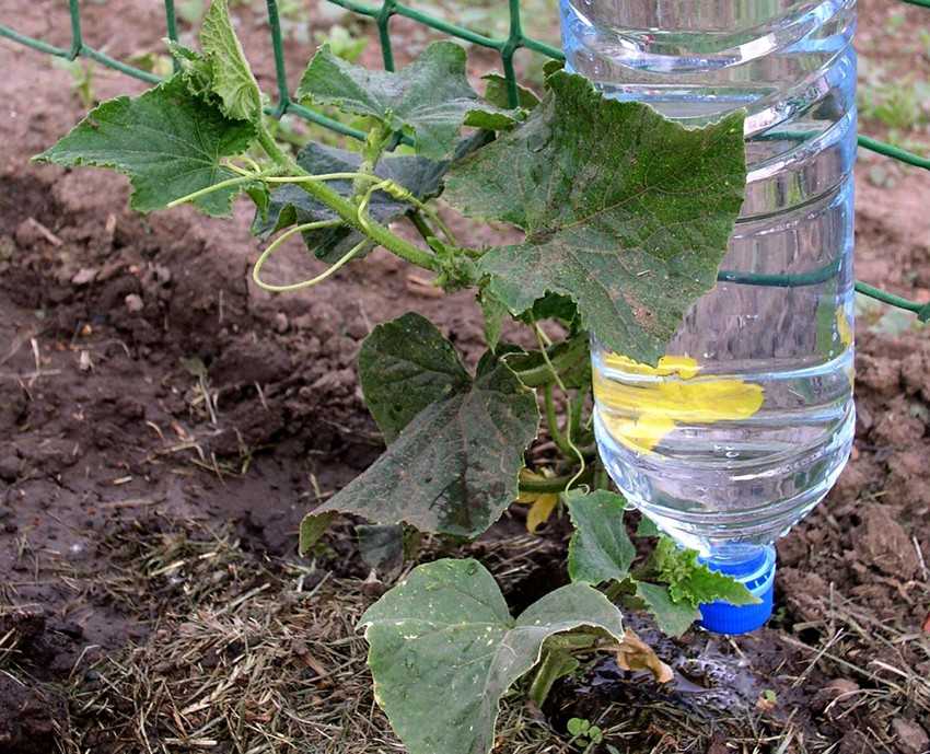 В промышленных системах капельный полив огурцов производится с подводом воды к каждому растению. Глубина расположения корней составляет 15-20 см и для контроля влажности там устанавливаются тензиометры. Для садоводов подойдут подручные средства, изготовленные из пластиковых бутылок. Их устанавливают на донышко или с закрытой пробкой в землю. Верхняя часть должна быть открытой для заполнения водой.
