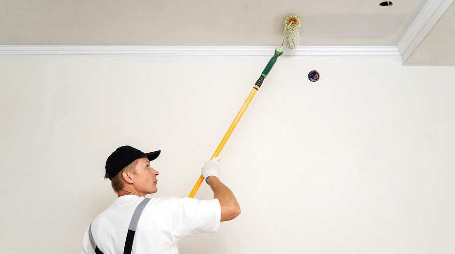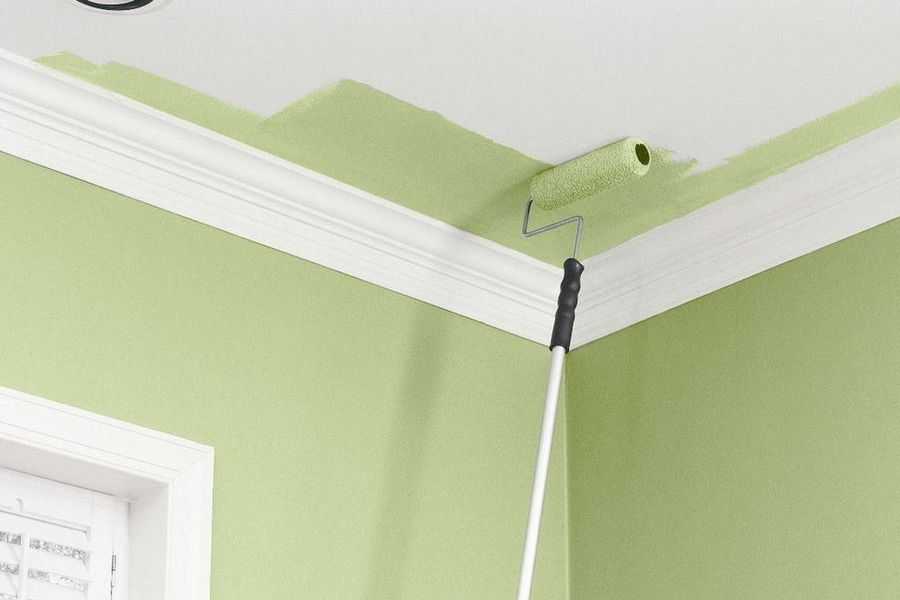 Применение кисти будет уместно для прокрашивания углов или потолочных плинтусов и не допускания глупых ошибок.