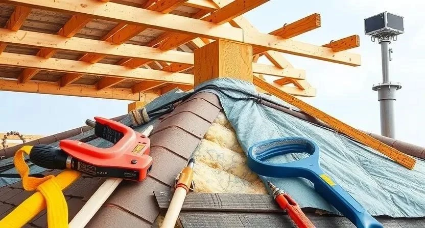 Замена поврежденных элементов: удалите все поврежденные элементы крыши и замените их новыми. Укрепление несущих конструкций: при необходимости укрепите несущие конструкции крыши с помощью металлических уголков или арматуры. Ремонт кровли: восстановите кровельное покрытие, используя подходящие материалы.