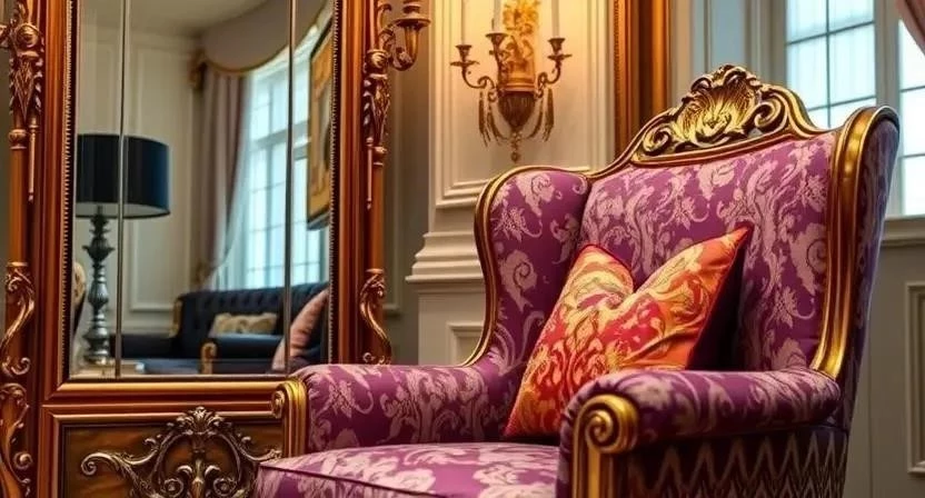 Ответ: Мебель должна быть массивной, роскошной и изготовленной из дорогих материалов. Обратите внимание на резьбу, позолоту и инкрустацию.