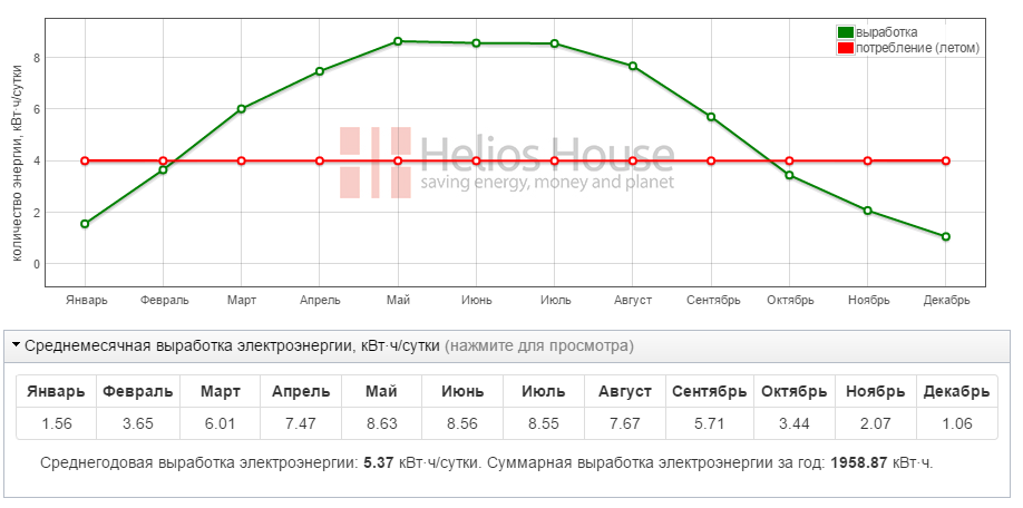 В калькуляторе вводим 4 в поле «средняя нагрузка», выбираем регион и смотрим на кривые выработки и потребления. Возьмём батареи покрупнее (монокристалл, 230 ватт, 6 штук). Видим, что с февраля по сентябрь наша потребность в электричестве почти перекрыта.