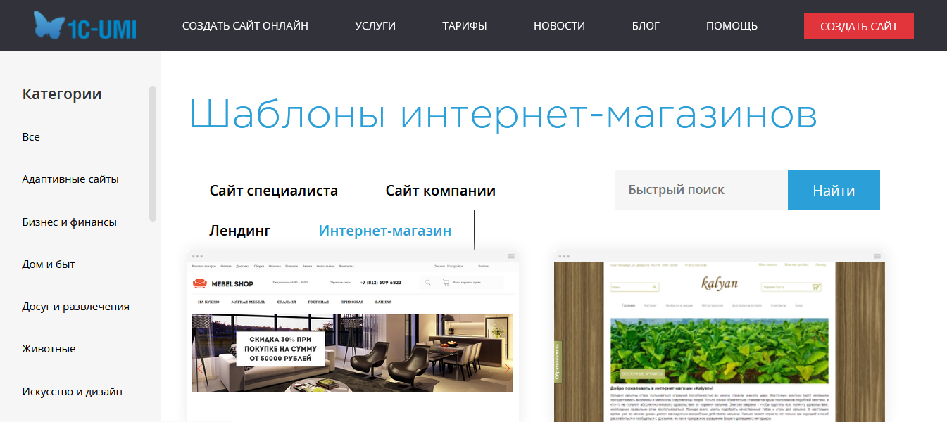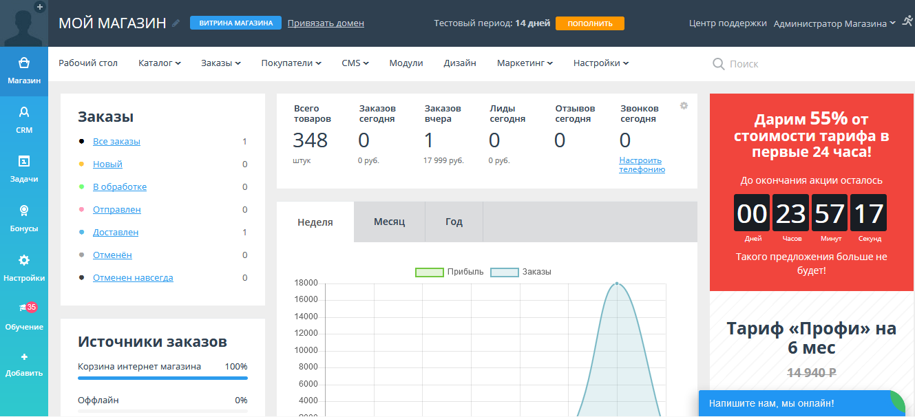 Есть возможность редактирования шаблонов, импорта товаров, интеграция с торговыми площадками Яндекс.Маркет, Google Merchant Center, Товары@Mail.ru, возможность назначения скидок, дополнительных подарков к покупаемому товару, предложение похожих товаров и товаров-дополнителей к покупке, возможность для покупателей оценить товары и оставить отзыв, собственная CRM. Вместе с тем сервис является довольно сложным и имеет небольшой выбор вариантов дизайна. Цена — от 990 р./месяц за тариф с минимальной функциональностью.