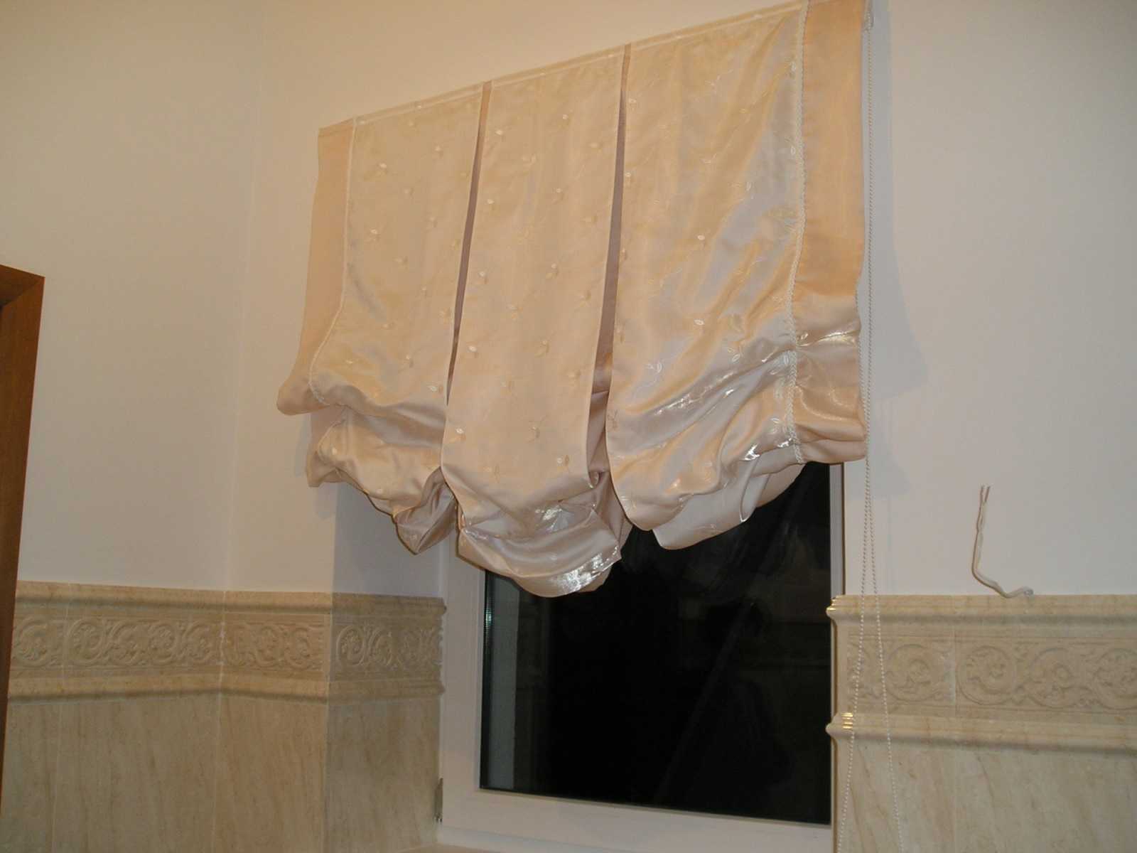 Верхняя часть римской шторы прочно закреплена на специальном карнизе, который снабжен подъемным механизмом.