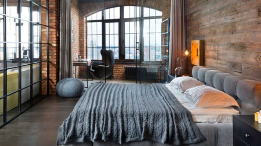 Индустриальные черты в спальне применяют в дизайне редко, ведь это направление лишь недавно было оценено сполна. Однако дизайн спальни в стиле лофт вовсе не выглядит холодным и мрачным, скорее стильным и экспериментальным.