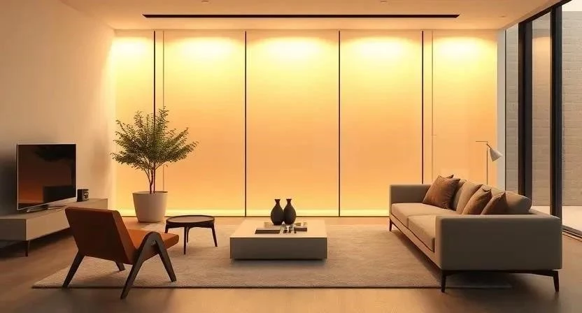 - Гостиная: Используйте стеклянные панели с подсветкой для создания акцентной стены за телевизором.