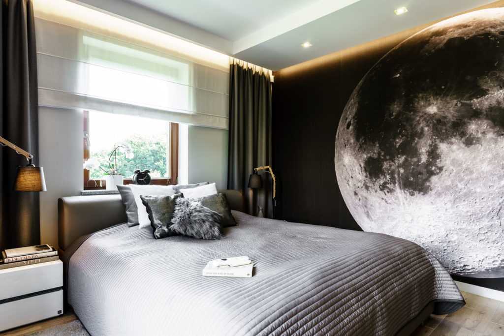 Фотообои для спальни, как и для гостиной, можно разделить на романтические и современные. Первые включают, прежде всего, цветочную графику, модные одуванчики, красивые пейзажи или тонкий гламурный дизайн. Тенденция романтических композиций также вписывается в обои на потолке, которыми мы можем любоваться, удобно расположившись на нашей кровати. В свою очередь, лучшими современными предложениями являются, прежде всего, черные узоры и контуры, интересные абстракции, надписи, текстуры, имитирующие материал или панорамы городов в двухцветном варианте.