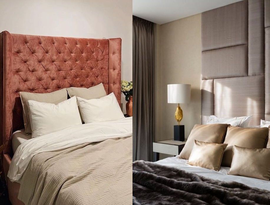 Идеальное решение для угловой комнаты или при выборе кровати без спинки. Стена может быть отделана разной формой обивки, кожзаменителем или тканью (замша, велюр, шелк).