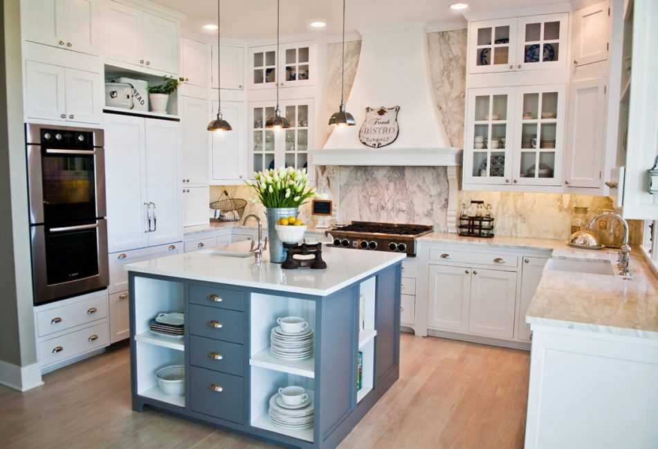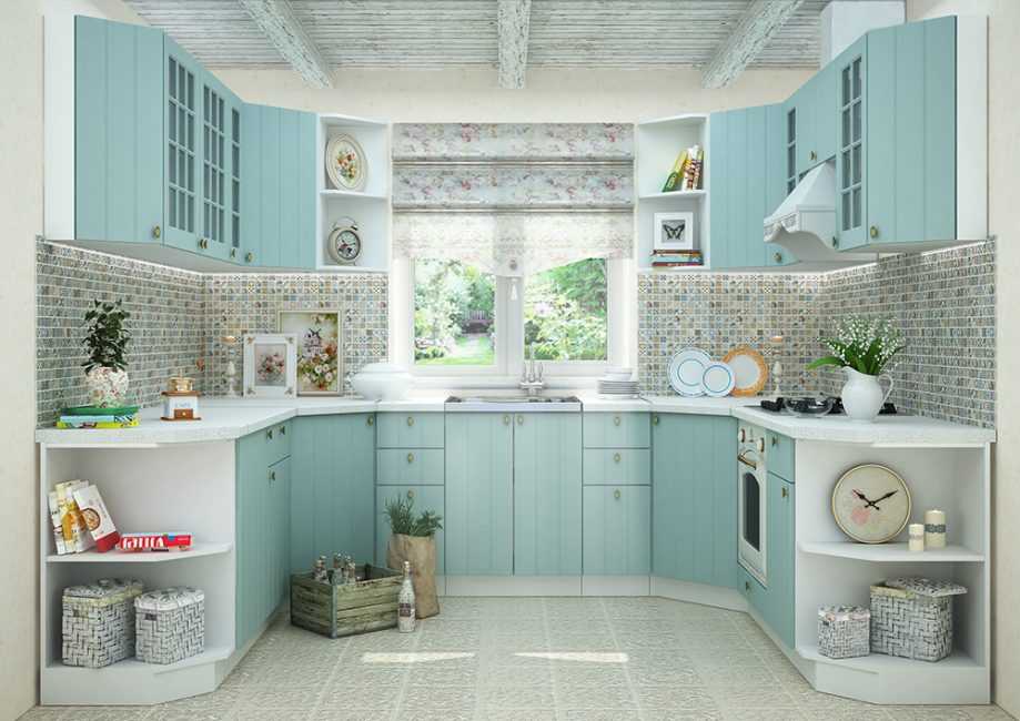 Среди цветовых вариаций, которые будут уместными в прованском стиле кухонь, могут быть использованы голубые оттенки. А с целью рационального использования пространства в помещении гарнитур стоит расположить под прямым углом. Простоту деревенского интерьера удастся подчеркнуть сервантом с витражами в цветочной технике, а деревянная окантовка мебели с вытяжкой в коробе, стилизованном под медь, окажутся уместными во французском интерьере.
