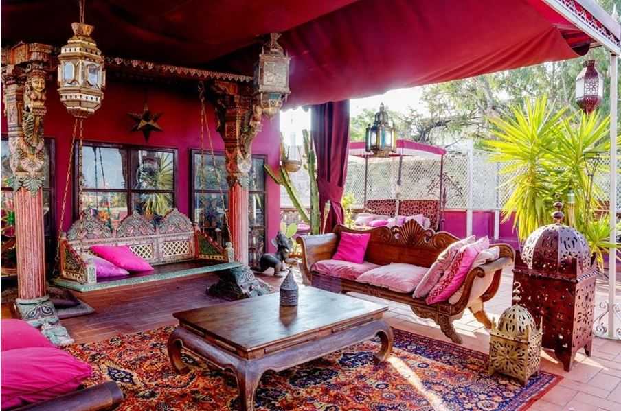 Характерная его особенность – везде много текстиля: здесь можно встретить ковры, занавески, балдахины и многочисленные аксессуары в виде красивых сундуков, светильников, статуэток богов. Помещения украшают и крафтовыми поделками, изготовленными собственными руками.