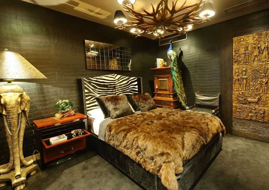 Меховое покрывало, изголовье кровати под зебру – характерные черты африканского стиля