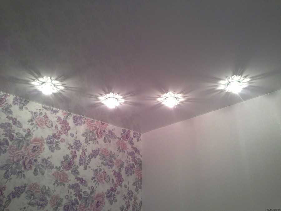 - Вровень с потолком. Такой способ расположения светильников хорош тем, что лампочки совсем не «съедают» место. Если в квартире низкие потолки, за счет точечного освещения они будут казаться выше. Минус у подобных светильников только один: ограничение по мощности 35 Вт, чтобы не расплавить ПВХ пленку.