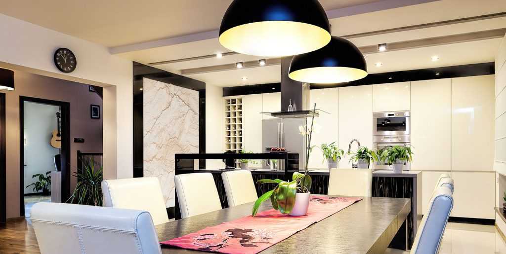 Для обеденных зон характерно центральное расположение, потому в кухне основное освещение над столом может быть сосредоточено на них. Эта зона должна быть залита светом люстр. С ролью дополнения для неё можно выбрать небольшие декоративные элементы. Они монтируются на потолках либо на стенах, которые есть в совмещённой кухне.