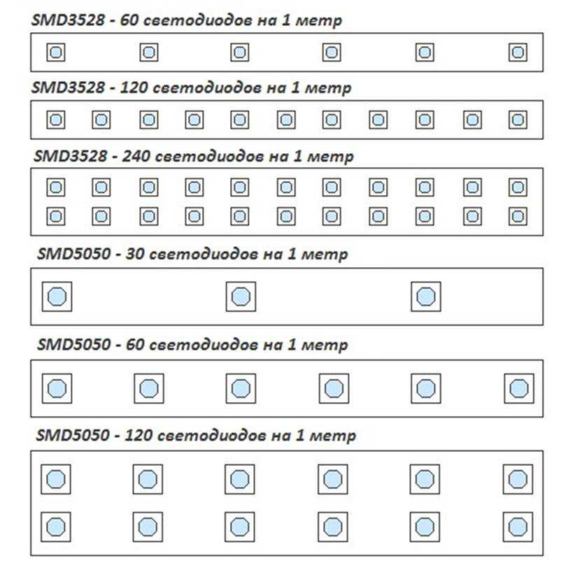 Примеры размещения светодиодов с разной плотностью и количеством рядов.