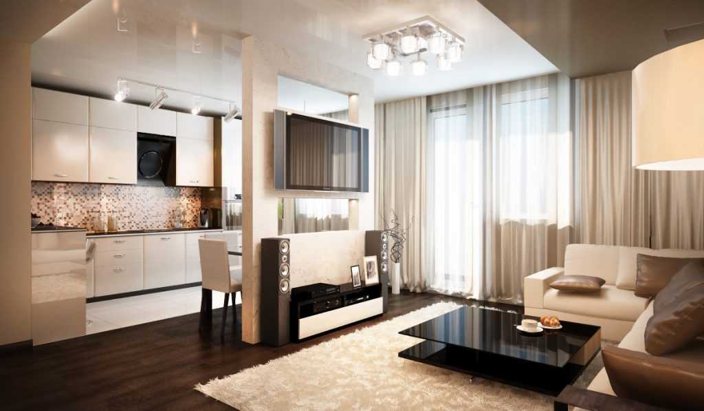 Чаще всего в помещениях с натяжным потолком отдают предпочтение светодиодным моделям. Они не нагреваются слишком сильно, потому это правильный выбор в плане безопасности. Главное не забывать о том, что зона отдыха требует более мягкого света по сравнению с остальными. Надо позаботиться и о комфортном размещении выключателей, благодаря чему освещение в кухне гостиной не будет раздражать.