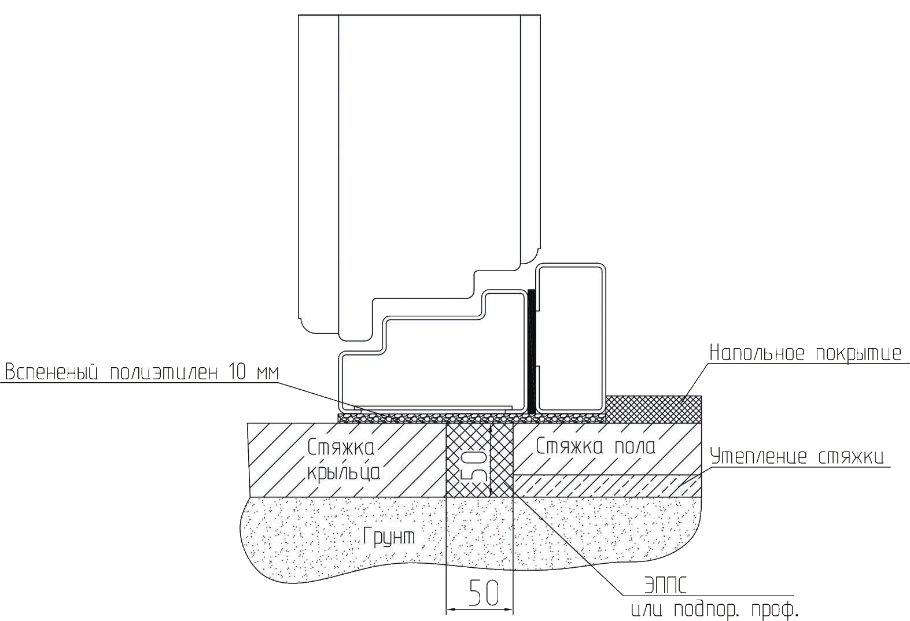 Для снижения теплопотерь через бетонную стяжку пола необходимо предусматривать разрыв между стяжками отапливаемого и неотапливаемого помещений или крыльца с заполнением его вставкой из экструдированного пенополистирола толщиной 50 мм и вспененным полиэтиленом (10 мм). Под порогом двери предусматривать монтажный зазор не менее 10 мм с заполнением негигроскопичным утеплителем (порилексом, экструдированным пенополистиролом). Данный разрыв должен располагаться под порогом двери. В качестве теплоизолятора может использоваться пластиковый подпороговый профиль.