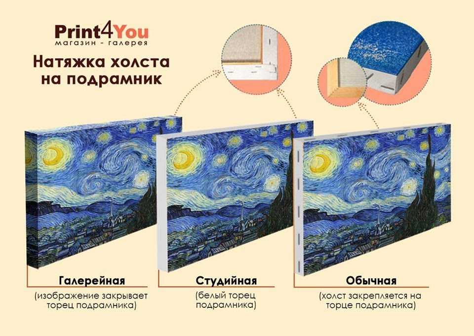 - Студийная — на торцах остается белое поле без покрытия печатью. Каждая скоба скрыта и вбивается сзади подрамника.