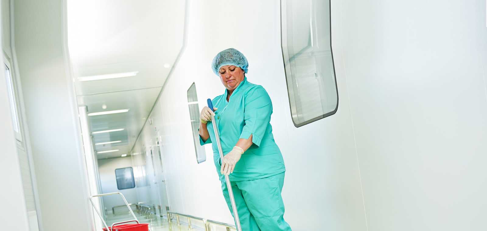 Работа в палатах начинается с ухода за кроватями, подоконниками, дверными ручками. В окончании чистят санитарный узел и также моют пол.