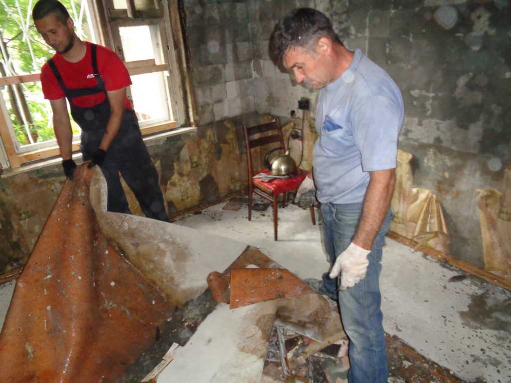- Счищают остатки обгоревших обоев, скручивают плинтуса и карнизы. Испорченные фрагменты выносят на свалку.