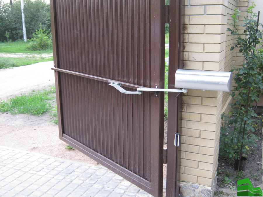 При встраивании линейного привода для распахивающихся сооружений наружу, трудности не возникают. Принцип открывания аналогичен тому, что используется при распахивании внутрь. Но открытая створка поворачивается на 90°.