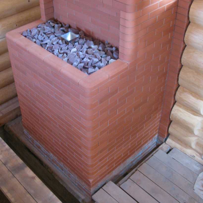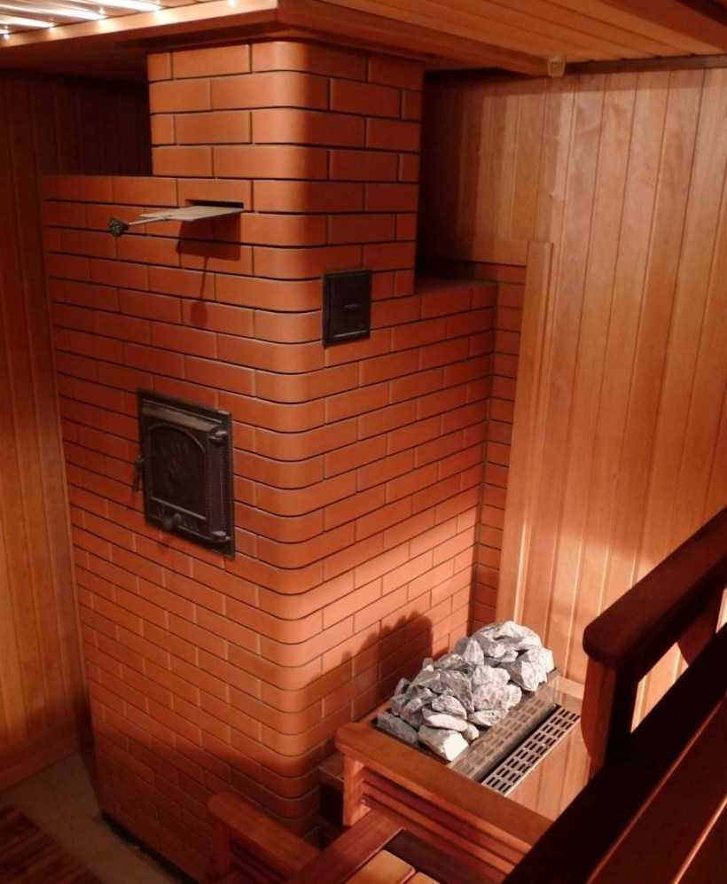 Деревянные бани отличаются повышенной пожароопасностью. Стены, потолок — практически все элементы парилки изготовлены из дерева. В деревянных помещениях печи сооружают преимущественно из кирпича. Приобретенные в торговой сети, металлические конструкции облицовывают природными камнями, кирпичом или искусственным камнем.
