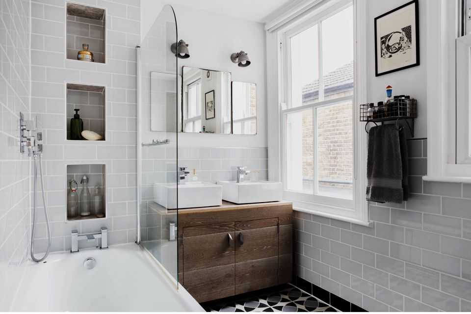 Отдельного внимания заслуживает решение об установке сдвоенной раковины. Это вполне приемлемый вариант для больших семей, в которых несколько членов собираются на работу/на учебу в одно и то же время.