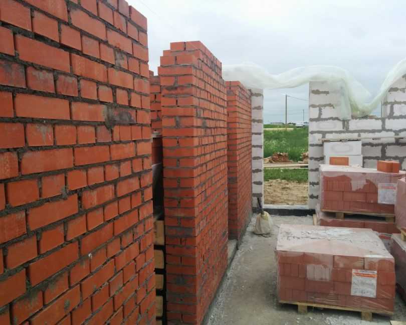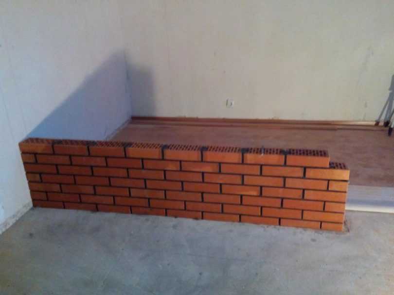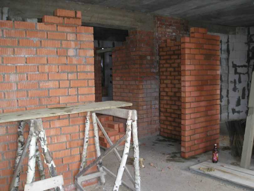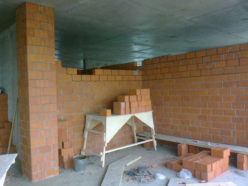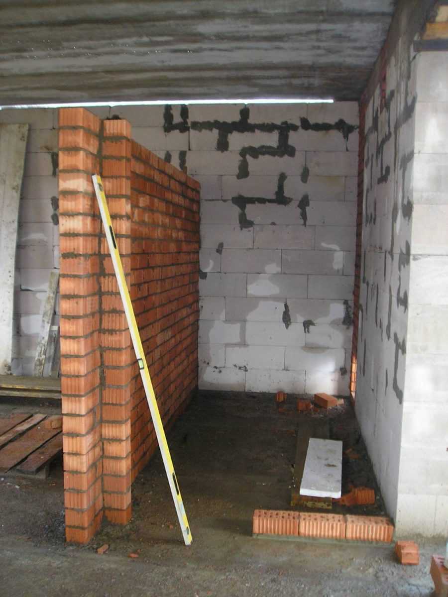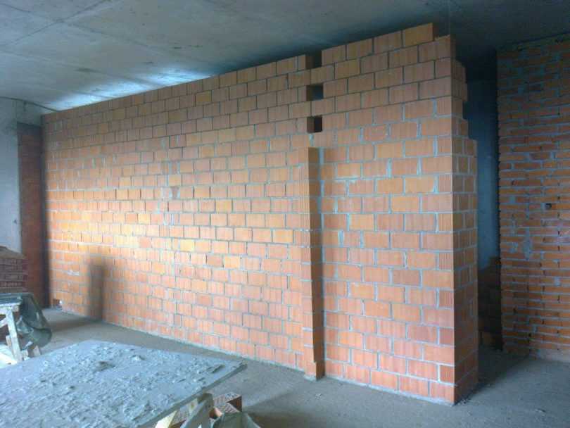 Поскольку одним из основных недостатков кирпича является большой вес, чтобы как-то сгладить эту проблему, материал при строительстве перегородок кладут в полкирпича либо на ребро. Возможны варианты, когда используют пустотелый блок, но при этом ухудшается звукоизоляция. Простенки возводят до того, как будет обустроена цементная стяжка. Для того чтобы обеспечить хорошую устойчивость возводимой конструкции и сцепление с основным каркасом, в основание (плиту или ленточный фундамент) вставляют металлическую арматуру, которая впоследствии закрепляется в вертикальный шов перегородки.