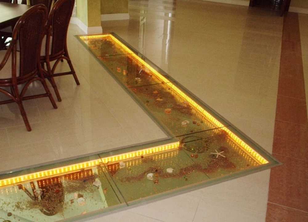 Световой пол — очень своеобразный способ оформить помещение в прихожей. Это квадратные светодиодные модули, которые монтируются в пол. Их можно выстроить в форме узора или оформить дорожку — будет смотреться оригинально, хотя такой тип освещения редко используется в интерьере квартиры.