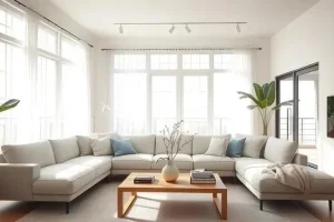 Удивительно выглядят гостиные, в которых акцентная стена отделана фотообоями с изображением лесного пейзажа на закате. На фоне такого оформления будет шикарно смотреться белый угловой диван с бежевыми подушками. Остальные стены в комнате стоит отделать полотнами нейтральных оттенков, потолок сделать белым, а пол – кремовым.