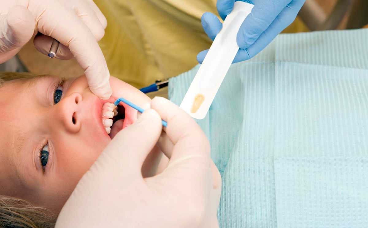 На поверхность зубной эмали наносят специальный состав с большой концентрацией фтора. Минеральное вещество способствует укреплению эмали, восстановлению ее структуры, помогает остановить дальнейший процесс разрушения тканей.