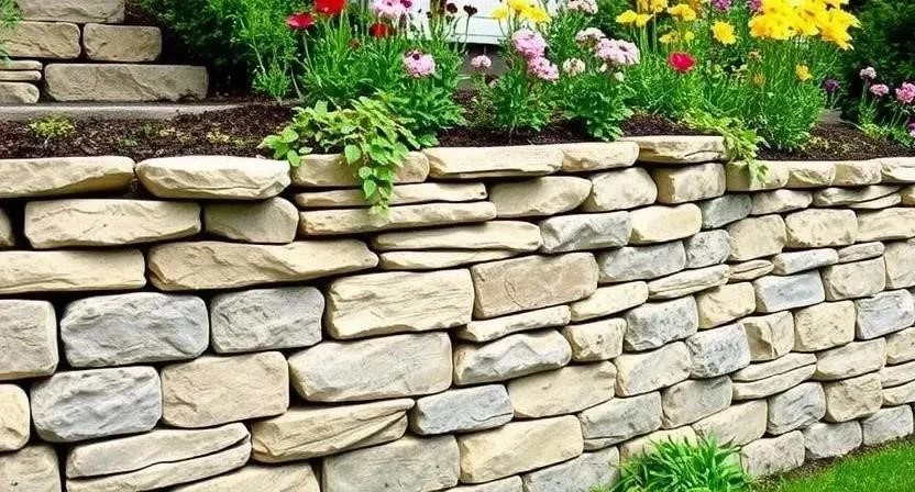 | Подпорная стенка | Натуральный камень | Растения | Подпорная стенка из натурального камня, украшенная растениями |