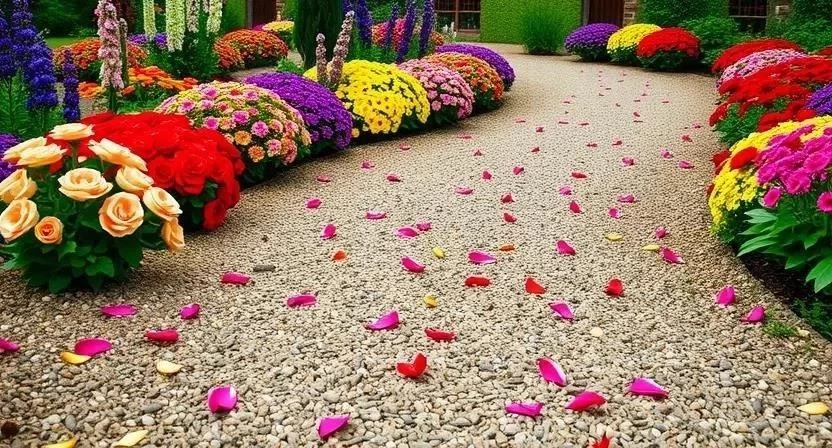 - Английский сад: Плавные линии, обилие цветов, естественность.