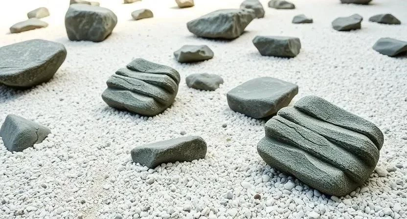 - Сад камней (карэсансуй): Состоит из камней, песка и мха, символизирующих горы, воду и острова.