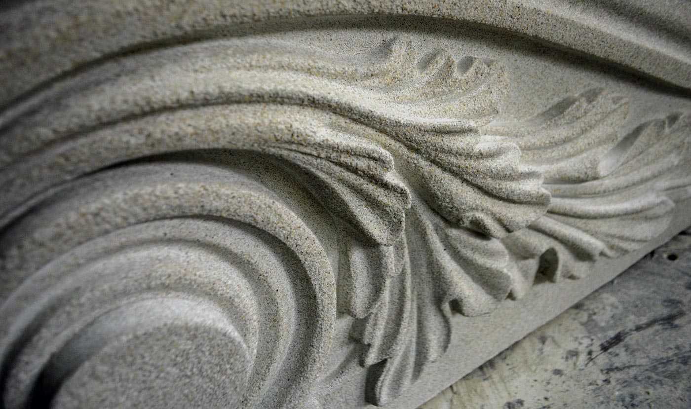 Декоры «под травертин» или песчаник выполняются практически по любой технологии. Это может быть замешанный в массе микс крошки натурального камня и пигментов или покрытие на тонкостенных декорах.