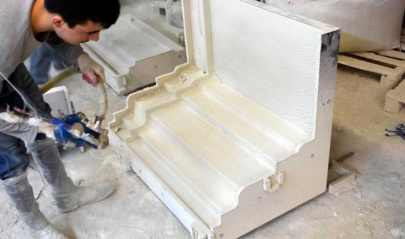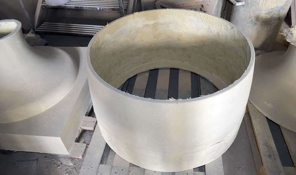 Пустотелые изделия получается методом набрызга на матрицу (пневмонабрызг). Первый (внешний) слой без волокон, затем с волокнами. Нанесенную массу прикатывают, уплотняют валиками. Изделие могут пропаривать при повышенной температуре и влажности либо использовать вместо этого химические добавки. После отвердения, поверхность шлифуют и могут покрыть декоративным слоем.