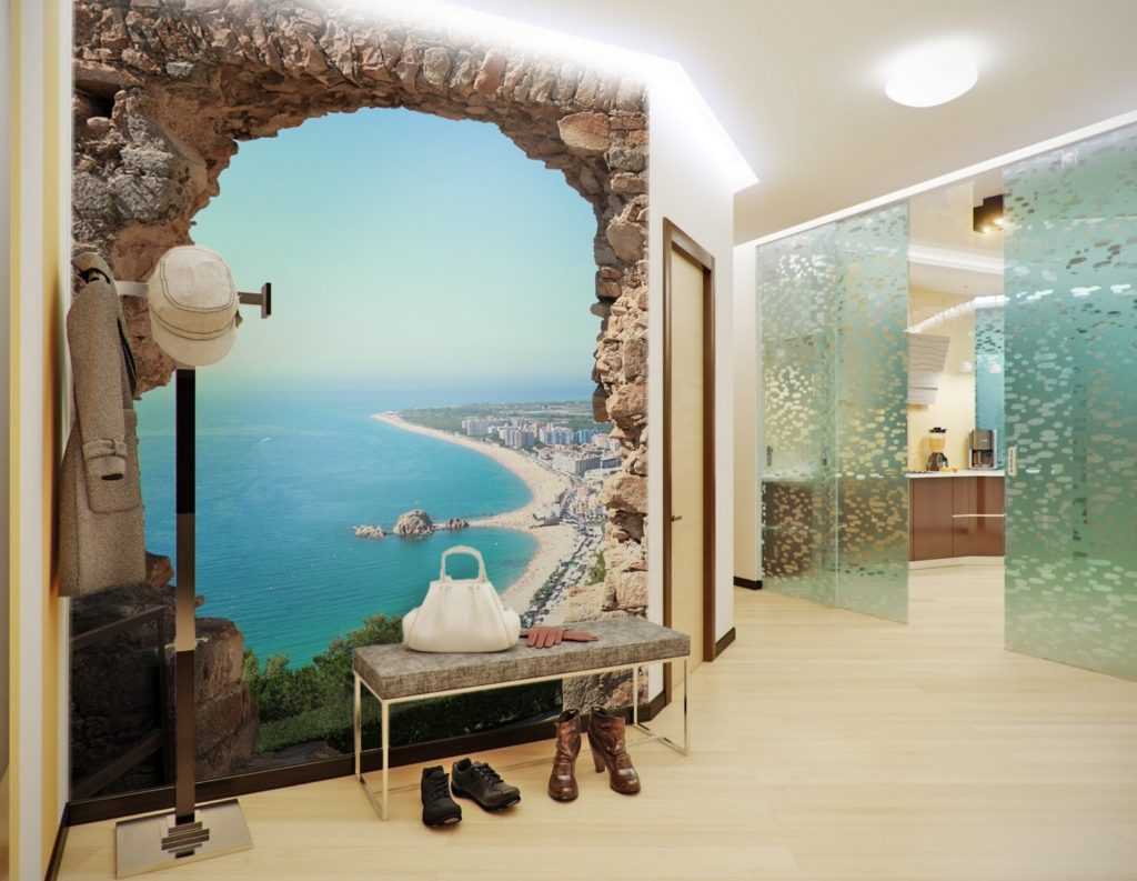 Маленькая прихожая требует смелости при выборе оформления, поскольку исправить пространство можно благодаря искажению восприятия. Данные иллюзии дают внутреннее ощущение простора, свободы и воздушного пространства. Этот эффект легко получить, если использовать фотопечать с изображением вида из окна, горный пейзаж или морские дали.