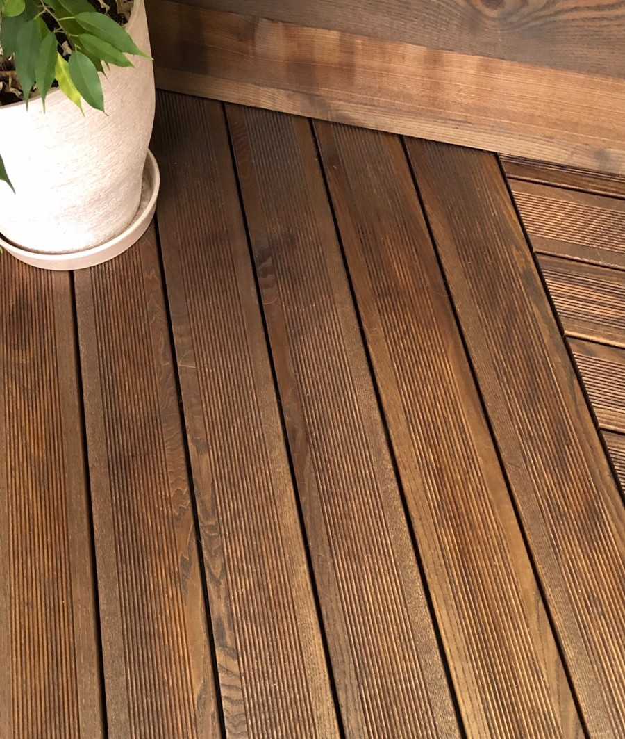 Термодревесина. Здесь также используется древесный массив, который дополнительно подвергается термической обработке. Температура +125/+190 градусов придаёт материалу повышенную прочность, снижает влагопоглощение. В результате, такой декинг не страдает проблемой неравномерной усадки пола.