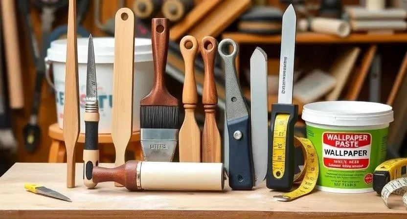 1. Подготовьте инструменты и материалы: обои, клей, валик, кисть, шпатель, уровень, карандаш, ножницы, рулетка. (Время: 30 минут)