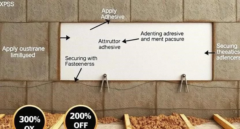 - Монтаж пенополистирола: Приклейте пенополистирол к фундаменту.